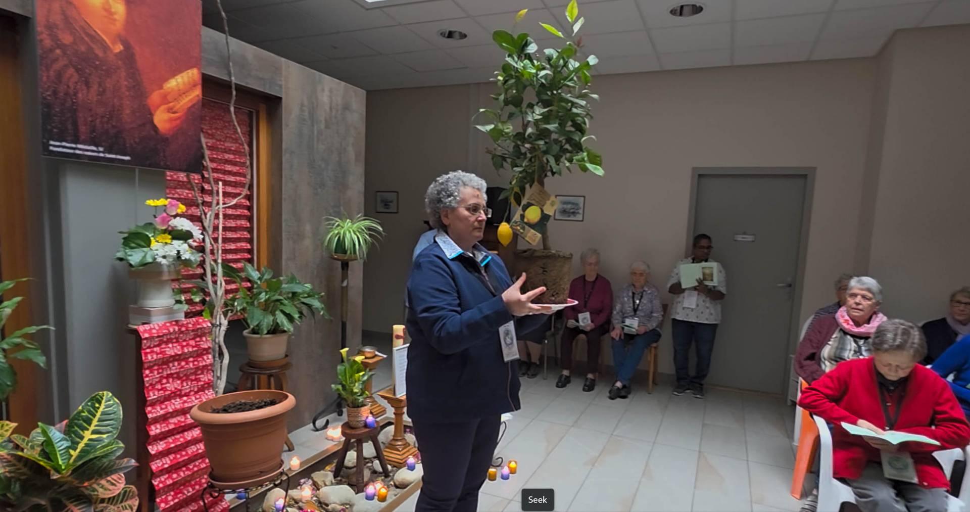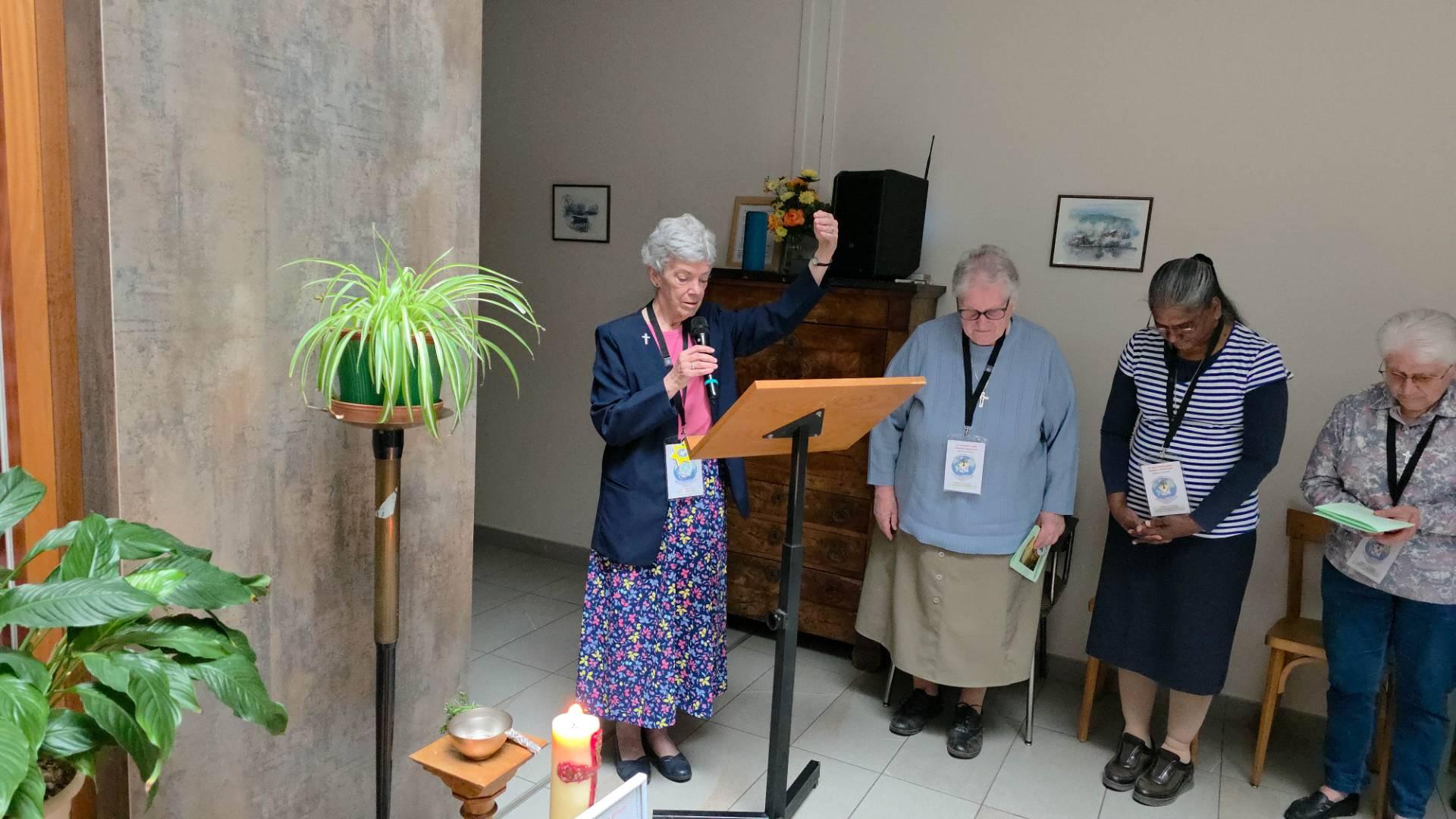 Irmã Dolores Lahr, expressou sua alegria por “voltar para casa” em Chambéry e invocou a presença da comunhão celeste dos Santos. Recordou à assembleia que a missão nunca é propriedade pessoal, mas participação na missão de Jesus, vivida através do carisma da comunhão. A paixão pela missão, afirmou, nasce de um amor profundo a Deus, que orienta cada escolha e dá sentido ao ministério e à vida cotidiana.