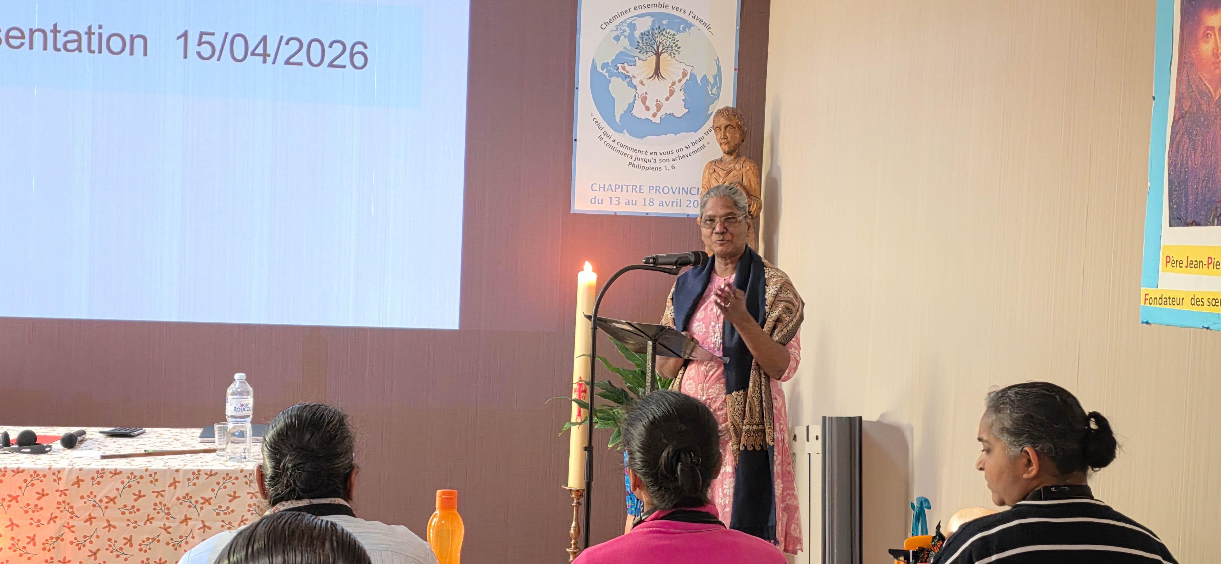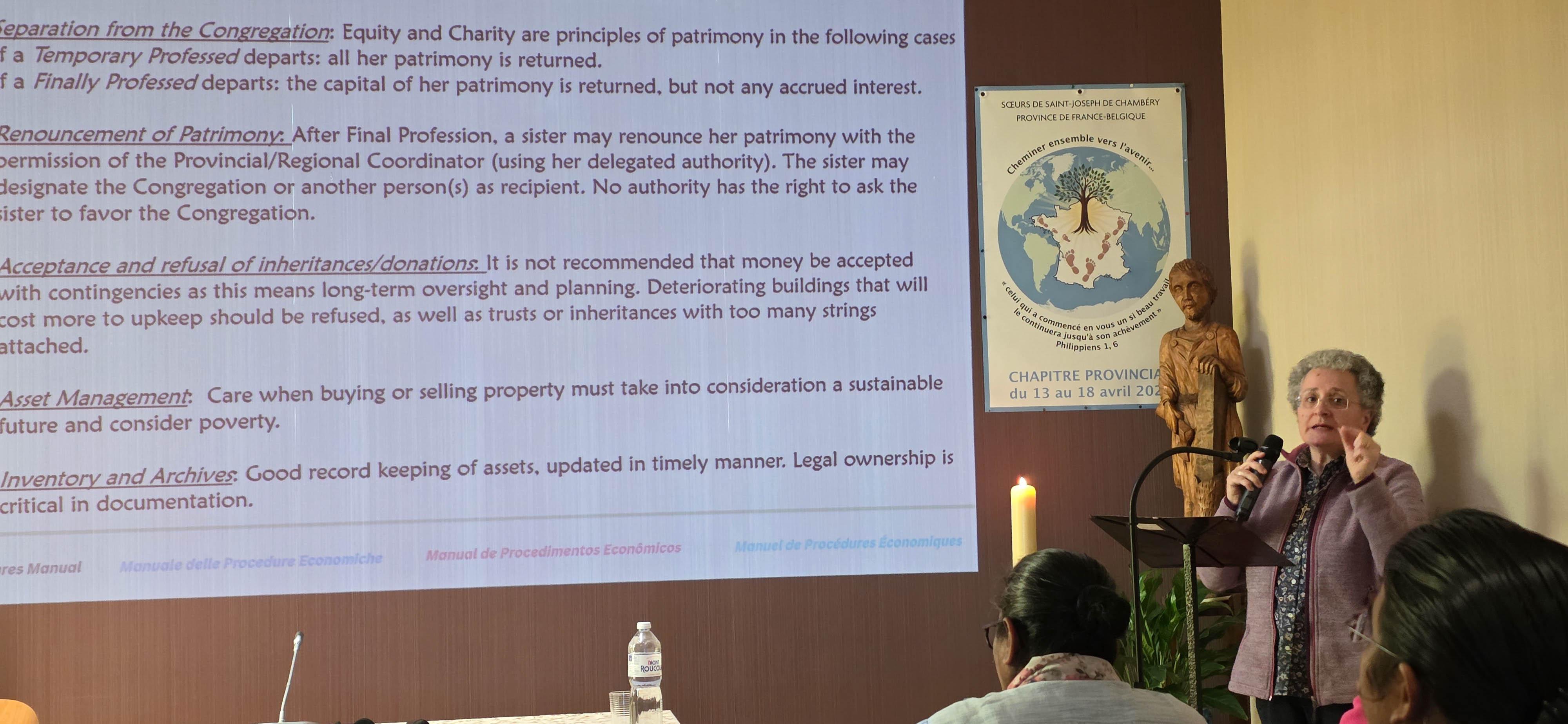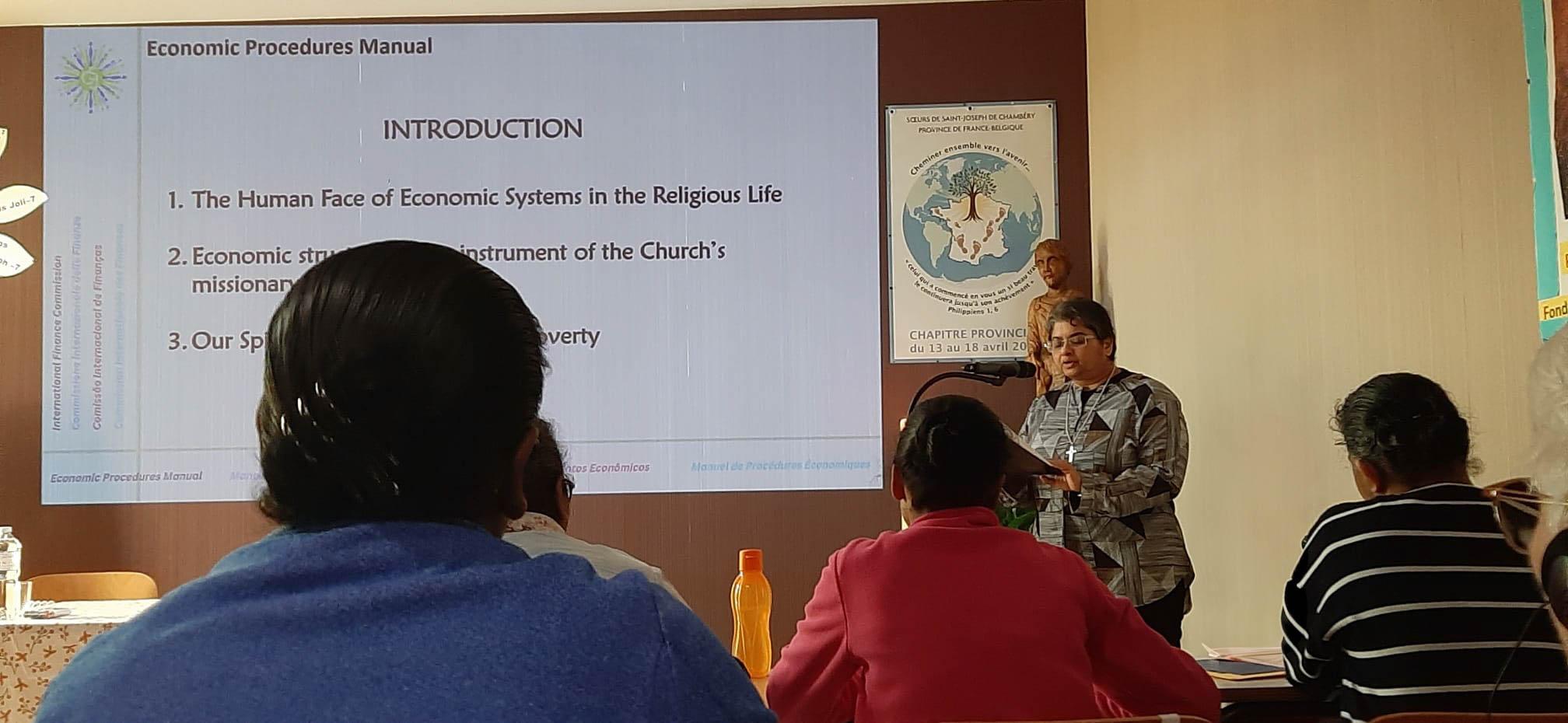 Após o momento de oração, as delegadas se reuniram no Sala Capitular, onde o senhor Renaud Aimard, Assessor Financeiro da Província França/Bélgica, apresentou uma visão geral da situação financeira atual da província. As Irmãs Cristina Gavazzi e Laveena D’Souza, em seguida, ofereceram uma apresentação concisa sobre o Manual de Procedimentos Econômicos, destacando seus principais elementos.