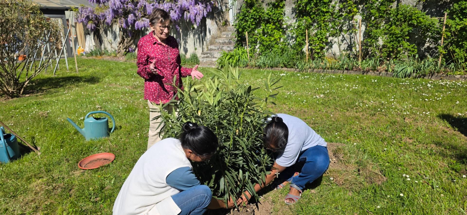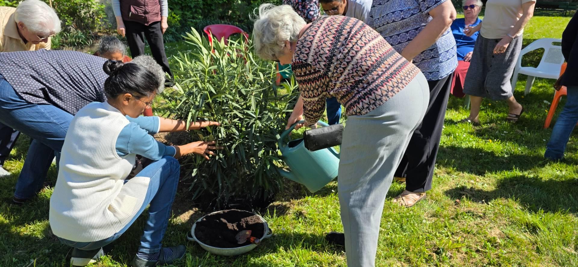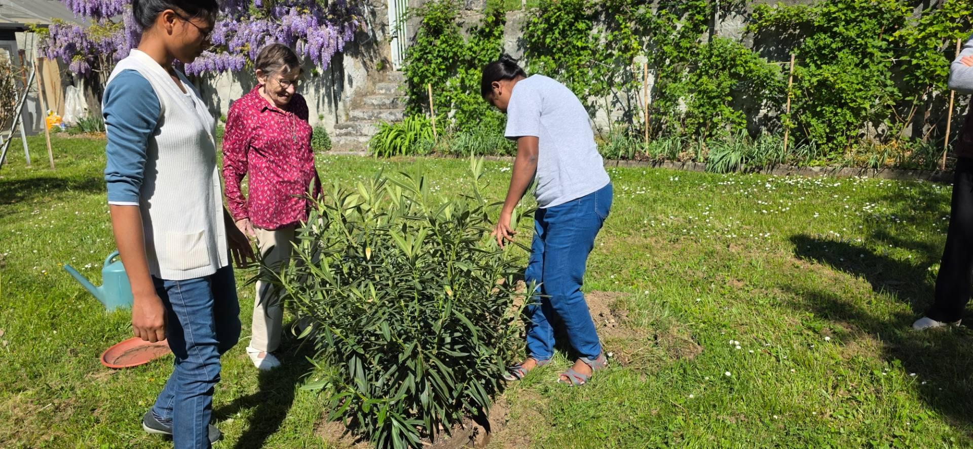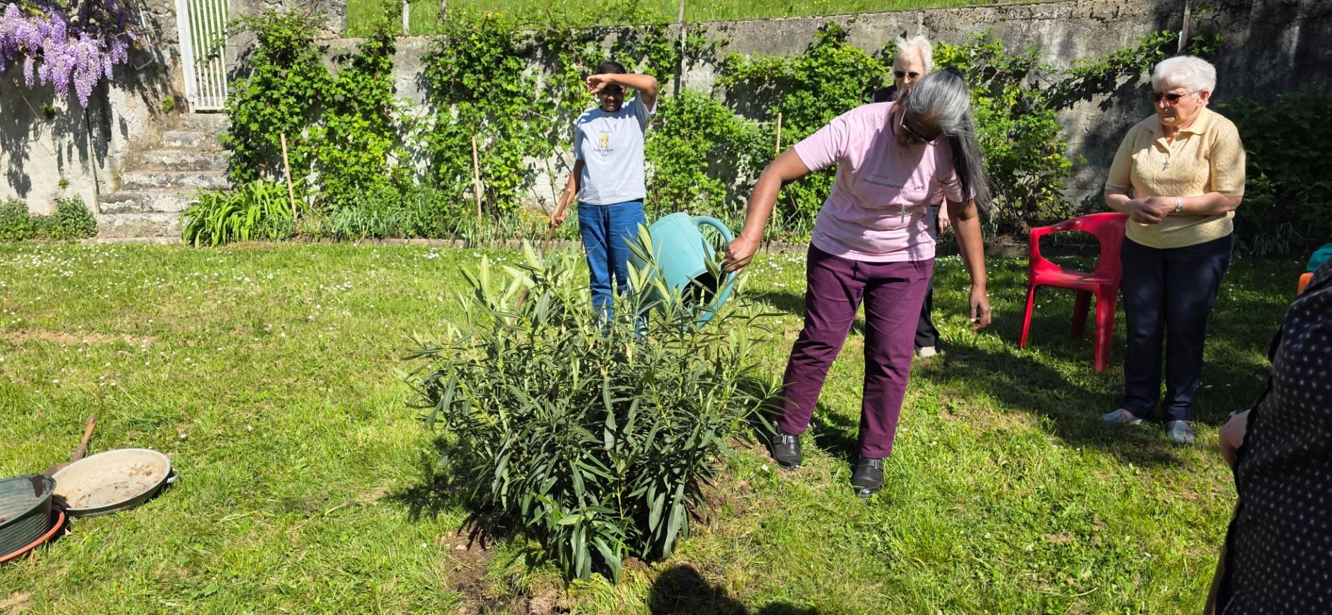 Durante o encontro, Irmã Nirmal e Irmã Sapna plantaram a jovem árvore no jardim de Bellecombet, na presença de Irmã Jeanne Thévenet, cuja participação conferiu ao gesto uma dimensão profundamente simbólica. O momento homenageava seu centésimo aniversário, celebrando um século de vida alegre e oitenta anos de consagração religiosa. Enquanto as Irmãs acrescentavam terra e água ao redor da muda, recordavam a bondade da Mãe Terra, nosso enraizamento comum e a força silenciosa que nasce da harmonia com a criação — respirando frescor e permanecendo no coração do florescimento da vida.